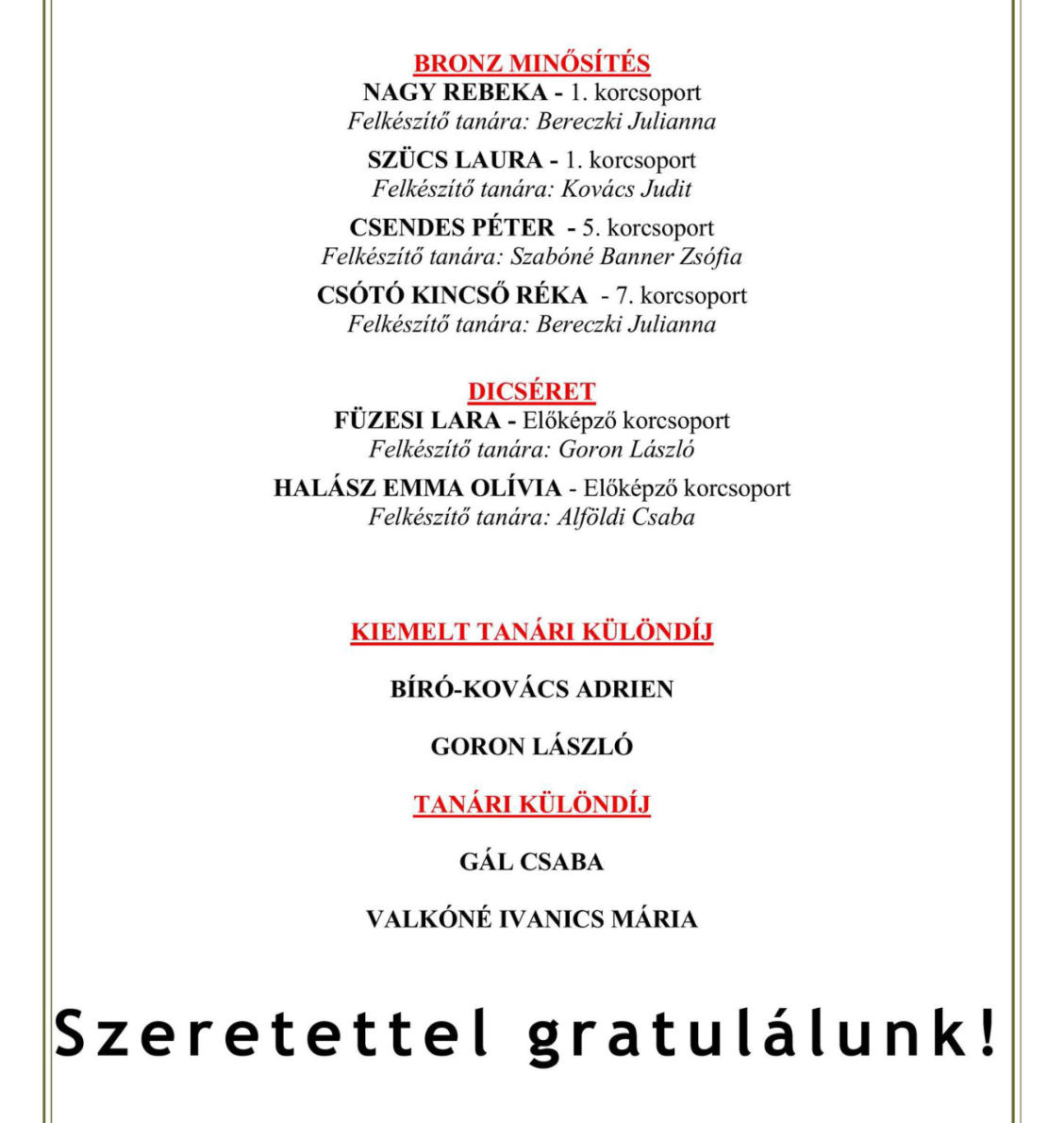 Kőrösiné Belák Erzsébet – értékelése nyomán az alábbi eredményekkel gazdagodott iskolánk tanszaka: